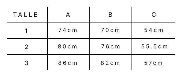 *Las medidas son sobre la prenda en plano SIN ESTIRAR* Estimativos en tallas alfabeticas : 1 : S/M 2 : M/L 3 : L/XL